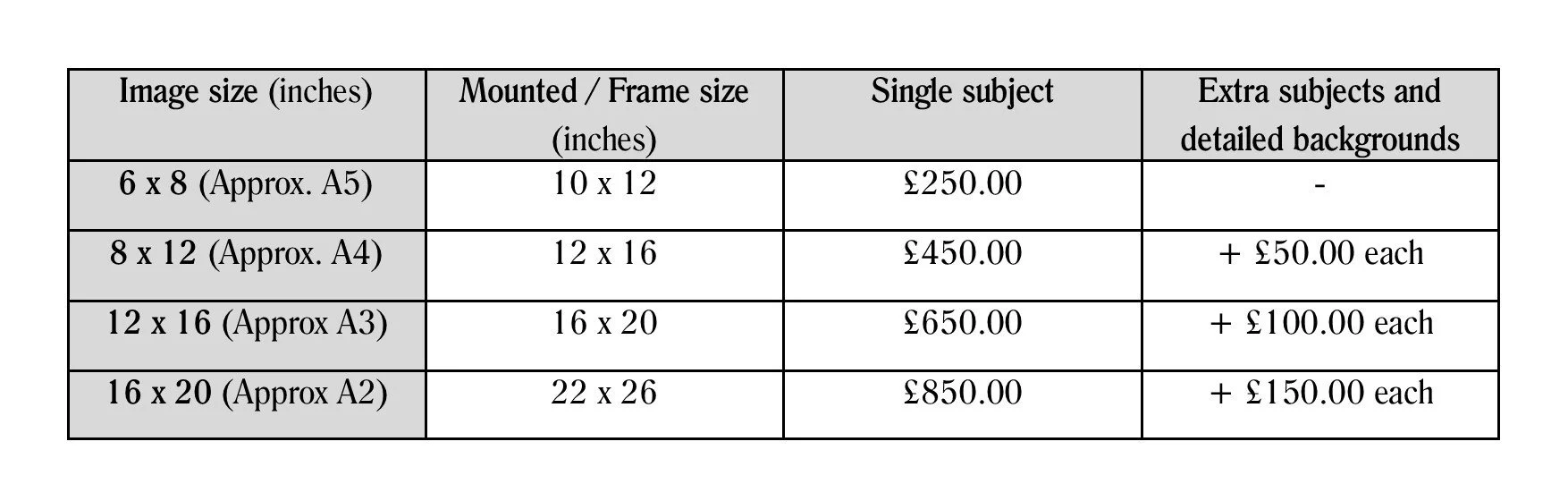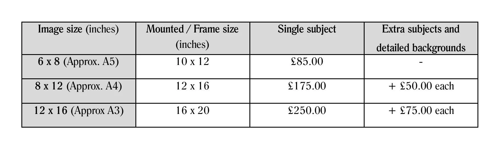 For watercolour and coloured pencil portraits, prices include photography of your animal within 10 miles of S70 5UA. If photography is required for pencil sketches or for other mediums at a further distance, a mileage charge of 40p per mile will apply for the return journey.